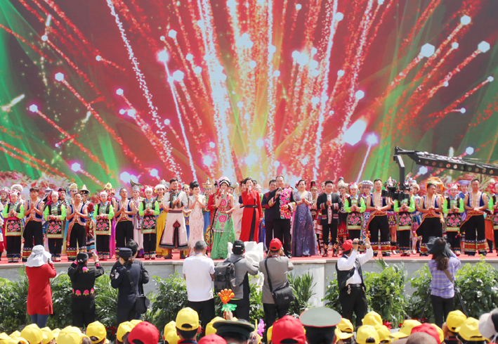 4月12日,“中华民族一家亲”庆祝楚雄彝族自治州成立60周年中央民族歌舞团走进南华慰问演出过程中,歌舞团的文艺工作者和演员们用欢快的舞蹈和悠扬的歌声为我县各族群众送上了一场丰富多彩、美轮美奂的文化盛宴,受到大家的热烈欢迎和高度赞赏。