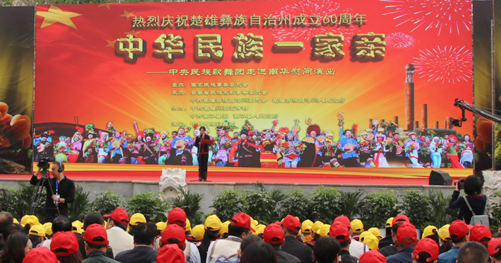 4月12日,由国家民委主办,云南省民宗委和州委、州人民政府承办的“中华民族一家亲”庆祝楚雄彝族自治州成立60周年中央民族歌舞团走进南华慰问演在县城龙泉广场举行。