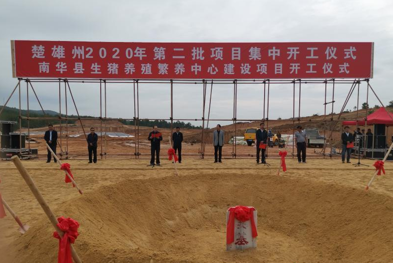 州委常委、州人民政府常务副州长赵克义,州政协副主席李德胜,南华县委书记李云升,县委副书记、县人民政府县长何文明等领导参加开工仪式,并为生猪养殖繁养中心建设项目培土奠基。