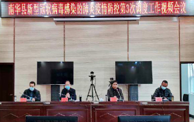 1月30日17:00时,南华县应对新型冠状病毒感染的肺炎疫情工作指挥部第三次调度视频会议在县公务中心一楼视频会议室召开。县委书记、县应对疫情工作领导小组组长李云升,县委副书记、县人民政府县长、县应对疫情工作领导小组组长何文明,县委常委、县人民政府常务副县长、县疫情防控指挥部指挥长石文武,县委常委、县委办主任何文育在主会场参会;各乡镇设分会场。会议听取了各乡镇近期疫情防控工作开展情况汇报。
