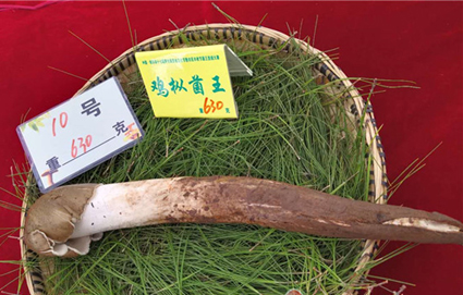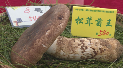 菌王选拔大赛,按照比赛的各项议程如火如荼地进行,通过一段时间的比赛,现场已有部分的菌王评选出来,放在展架上面是牛肝菌菌王和虎掌菌菌王,通过外表可以看到它的外观非常的鲜艳,它的形象也非常饱满,这朵牛肝菌菌王是净重1050克,虎掌菌菌王这一朵重达1830克。菌王评选标准是进行当场称取参赛菌子的重量,从新鲜度、完整性、光泽度、品质进行综合评判。