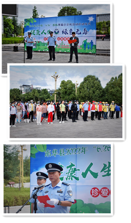为深入贯彻习近平总书记关于禁毒工作重要指示精神,全面落实国家禁毒委《关于加强新时代全民禁毒宣传教育工作的指导意见》,广泛动员社会力量参与禁毒斗争,积极营造浓厚的禁毒社会氛围,以实际行动迎接党的二十大胜利召开。6月24日上午,在第35个国际禁毒日来临之际,南华县禁毒办以“健康人生,绿色无毒”为主题,组织县禁毒办成员单位、邮政快递员、外卖骑手等100余名各行各业禁毒志愿者,在南华县市民广场开展以“健康人生 绿色无毒”为主题的“6.26”国际禁毒日系列宣传活动,掀起了禁毒宣传新热潮。