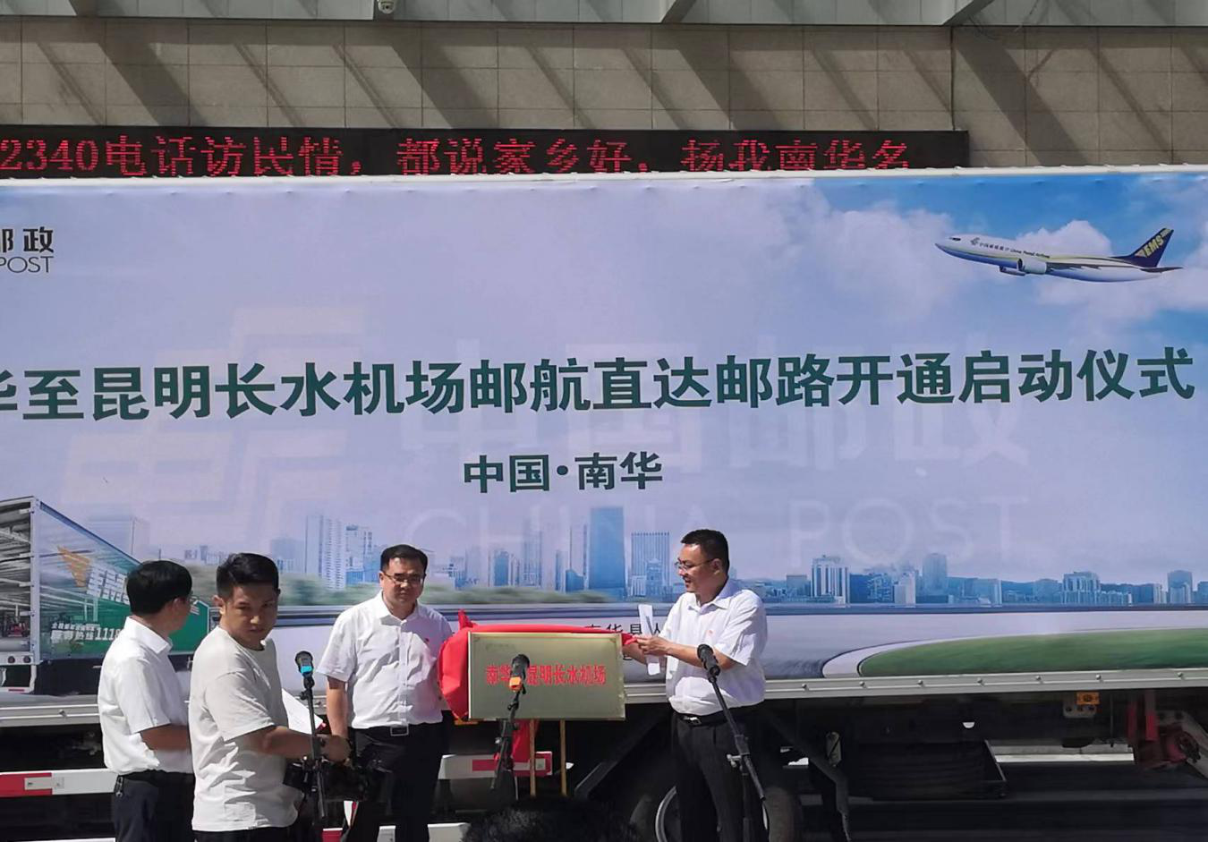 邮路开通仪式现场,县委书记马特、中国邮政集团楚雄分公司党委书记、总经理杨领周共同为邮路开通仪式揭牌,最后县委书记马特宣布南华至昆明长水机场邮航直达邮路正式开通,等候在现场的邮路车辆满载南华生鲜农特产品发车驶向昆明长水机场。