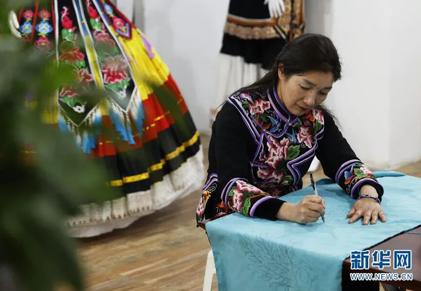 绣工在制作彝绣(3月6日摄)。新华网 刘东摄
