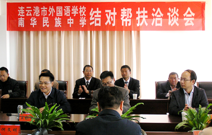 在随后召开的连云港外国语学校与民族中学结对帮扶洽谈会上,县委副书记、县人民政府县长何文明致辞,对连云港市教育局、连云港外国语学校长期以来对我县教育社业发展的关心、帮助和支持表示感谢。何文明指出:连云港外国语学校作为中国西部教育顾问单位,从2011年开始,挂点联系民族中学,建立友好关系,对我县教育工作给予大力支持,尤其县民族中学的教学工作在连云港外国语学校的帮扶下取得了可喜的成绩。何文明强调,江苏是全国经济社会发展水平较高的省份,尤其是教育事业的发展更是走在全国前列,很多方面值得学习,此次把我县作为教育结对帮扶单位,明确连云港外国语学校与我县民族中学结为帮扶对子,更是体现了对我县教育事业的关心和支持;希望连云港外国语学校以此为契机,全面深化合作,加大对我县师资队伍的培训,并选派骨干教师到我县开展具体帮扶指导;同时希望县民族中学要紧紧抓住机遇,加强与连云港外国语学校的对接联系,进一步加强学校管理,强化教师队伍建设,促进教育教学水平再上一个新台阶。