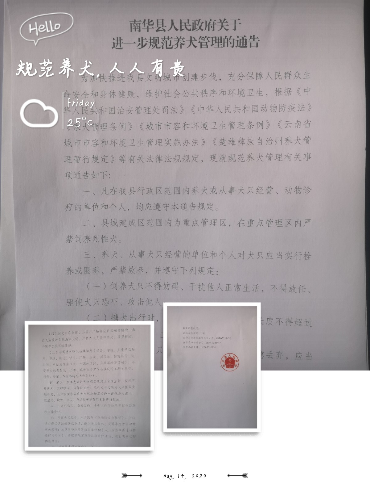 制发《南华县人民政府关于进一步规范养犬管理的通告》400份,充分利用新闻、电视、媒体、微信、网站等宣传平台,广泛宣传文明养犬相关知识,积极营造文明养犬氛围。对遛犬不拴牵引绳、犬只随地便溺等行为进行教育及曝光,对养犬犬主进行教导,不允许犬只进入公园,要求犬只一律实行圈养、拴养,教育引导广大市民文明养犬。