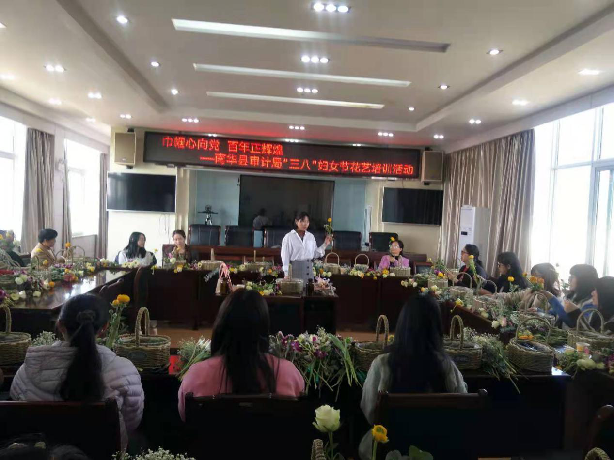 3月8日,在第111个“三八”国际劳动妇女节之际,南华县审计局组织开展以“巾帼心向党·百年正辉煌”为主题的“三八节”花艺培训活动,邀请了专业的花艺师现场教学,40余名女职工参加培训。