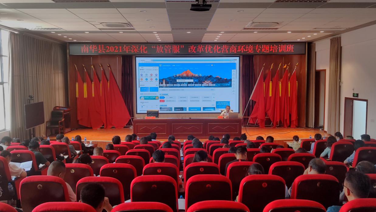 5月27日,南华县举办2021年“放管服”改革优化营商环境专题培训班,各乡镇人民政府、县级有关部门分管领导及工作人员共计110余人参加了培训。培训班诚邀州政务服务局党组成员、副局长杨玉江同志、州政务服务局电子政务规划管理科杨开明同志进行专题辅导。