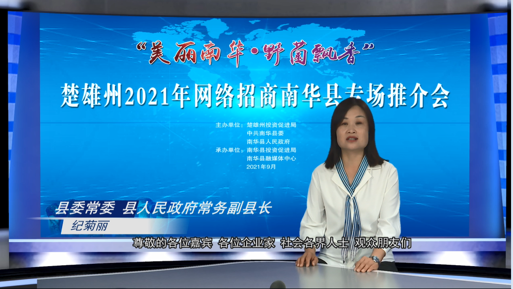 为深入贯彻落实习近平新时代中国特色社会主义思想,统筹推进新冠肺炎疫情防控常态化和经济社会发展,全面推进招商引资工作在疫情防控期间持续开展。经过精心筹备,2021年9月17日上午9:00,楚雄州2021年网络招商南华县专场推介会准时举行。