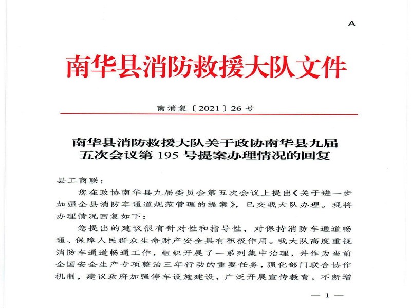 南华县工商联在政协南华县九届委员会第五次会议上提出《关于进一步加强全县消防车通道规范管理的建议》,收到提案建议后,南华县消防救援大队高度重视,建立完善办理工作机制,强化工作职责,明确办理要求,把提案办理工作作为推动消防安全工作的有力抓手,确保提案办理件件有答复、事事有跟进、处处有落实。对明确的重点提案,大队及时开展调研,听取相关部门、乡镇的意见建议,使答复意见更具针对性、可操作性,切实提高办理质量。