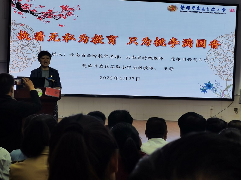 2022年4月27日,州委组织部组织的楚雄州兴楚人才专题报告会在南华县龙川小学举行。龙川小学、东城小学、北城小学及教研师训中心共计70余人参加了报告会。报告会由南华县教育体育局教研师训中心主任周晓光主持,云南省教学名师、楚雄州兴楚人才、楚雄开发区实验小学高级教师、特级教师王静作了《执着无私为教育,只为桃李满园香》的报告。