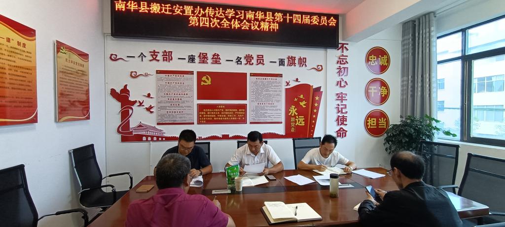 8月11日,南华县搬迁安置办公室党组召开干部职工会议,专题传达学习十四届县委四次全会精神。