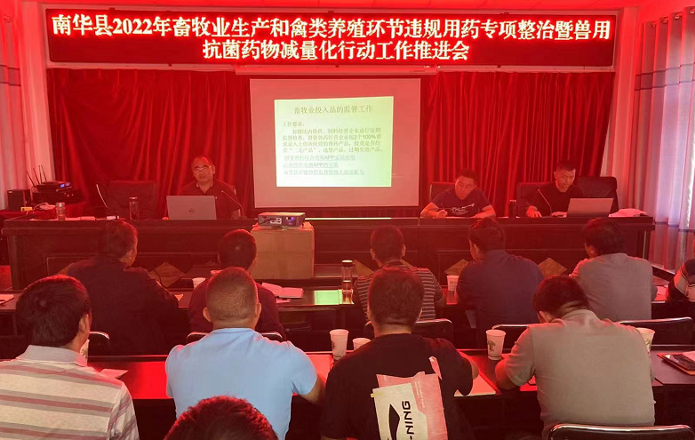 今日,南华县农业农村局召开全县畜牧业生产和禽类养殖环节违规用药专项整治暨推进兽用抗菌药物减量化行动工作推进会。县农业农村局分管领导,畜牧兽医水产股、县动物疫病预防控制中心、县动物卫生监督所负责人;各乡镇农业农村服务中心畜牧兽医工作负责人;各乡镇辖区内禽类饲养达1000羽及以上的养殖主体;参加第一批兽用抗菌药物减量化行动示范养殖场法人(养殖主体);县重大动物疫病防治指挥部办公室及县动物卫生监督所全体人员共85人参加会议。