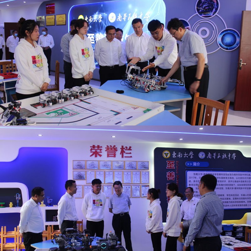调研组先后参观了学校的校史展厅、师生书画展厅及至善科技馆。了解学校的校园文化、办学情况、办学特色、教育教学现状及取得的成绩。东南大学第24届研究生支教团成员为调研组一行展示了运用编程对机器人运动轨迹进行设计和操作的过程。