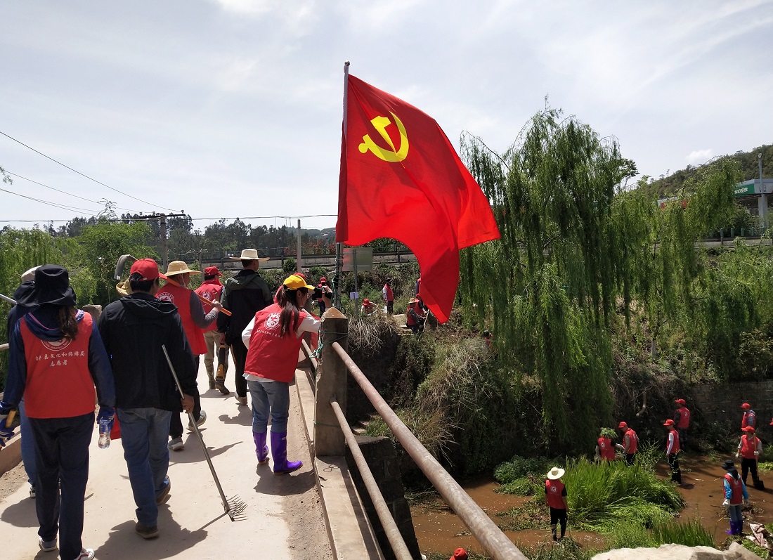 在活动现场,党员干部们头顶烈日,身着志愿服,手拿锄头、铁锹、砍刀、靶子等工具,不怕苦、不怕脏、不怕累,心往一处想、劲往一处使,齐心协力对河道内垃圾、枯枝烂叶、破旧弃品等进行打捞,对河道两岸堤防杂草、杂树木、垃圾等进行清除清运,在炎炎烈日下干得热火朝天,胸前鲜红的党员徽章在阳光的照射下熠熠生辉,穿梭忙碌的身影在龙川江沿岸形成一道靓丽风景。