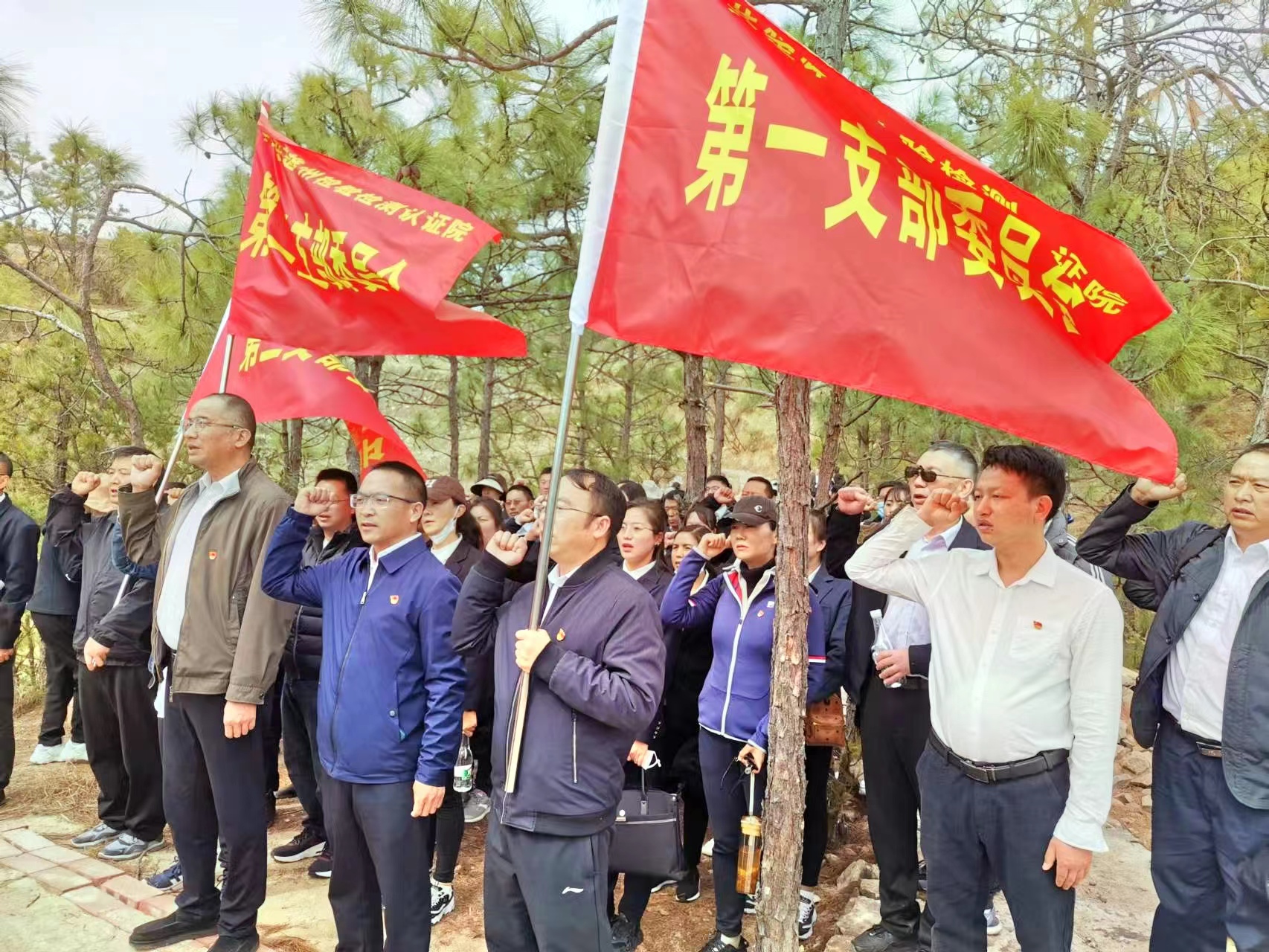 在红军长征过镇南纪念碑前,大家肃立注目,面对鲜红的党旗,全体党员举起右拳庄严宣誓:“我志愿加入中国共产党,拥护党的纲领,遵守党的章程,履行党员义务,执行党的决定,严守党的纪律,保守党的秘密,对党忠诚,积极工作,为共产主义奋斗终身,随时准备为党和人民牺牲一切,永不叛党。”回顾入党宣誓时的庄严承诺与坚定决心。