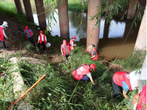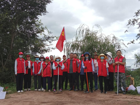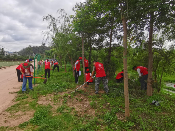 志愿者们在闷热的夏日中,身着志愿者服装,纷纷撸起袖子,拿起锄头、钉耙、镰刀、编织袋等工具,对沿岸上的白色垃圾、建筑垃圾、枯木杂草根枝等进行全面清理。