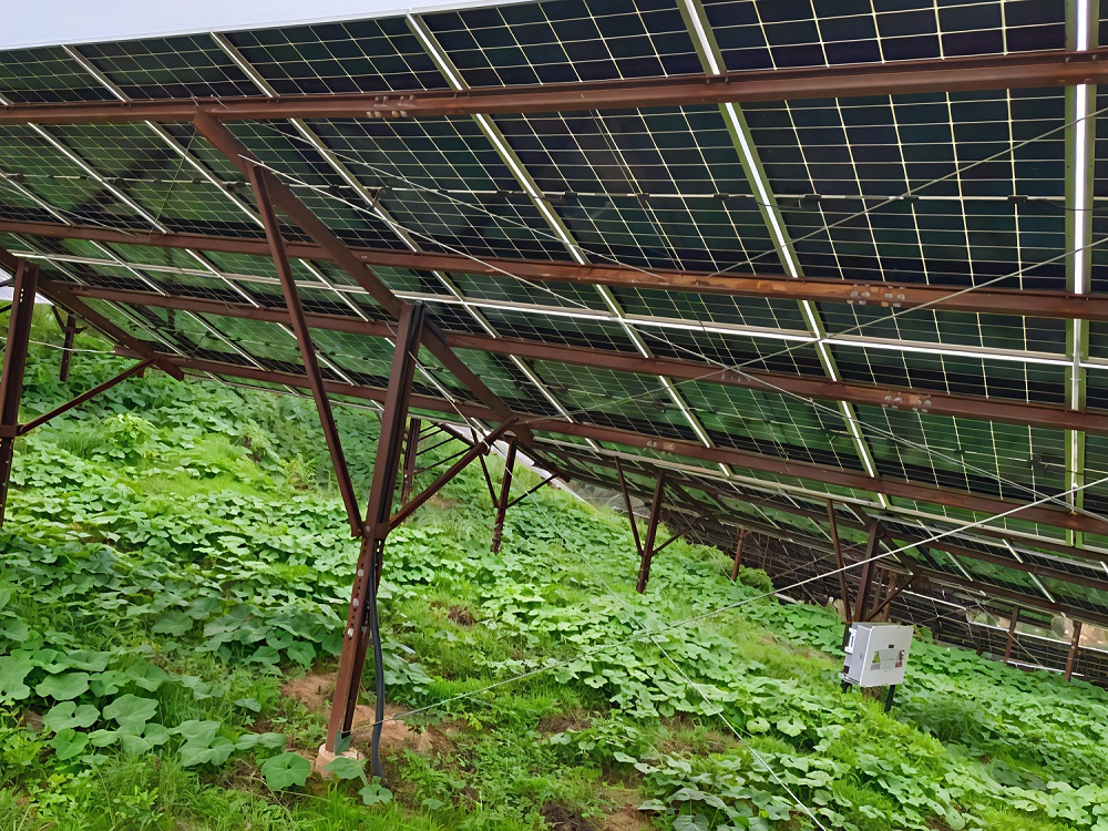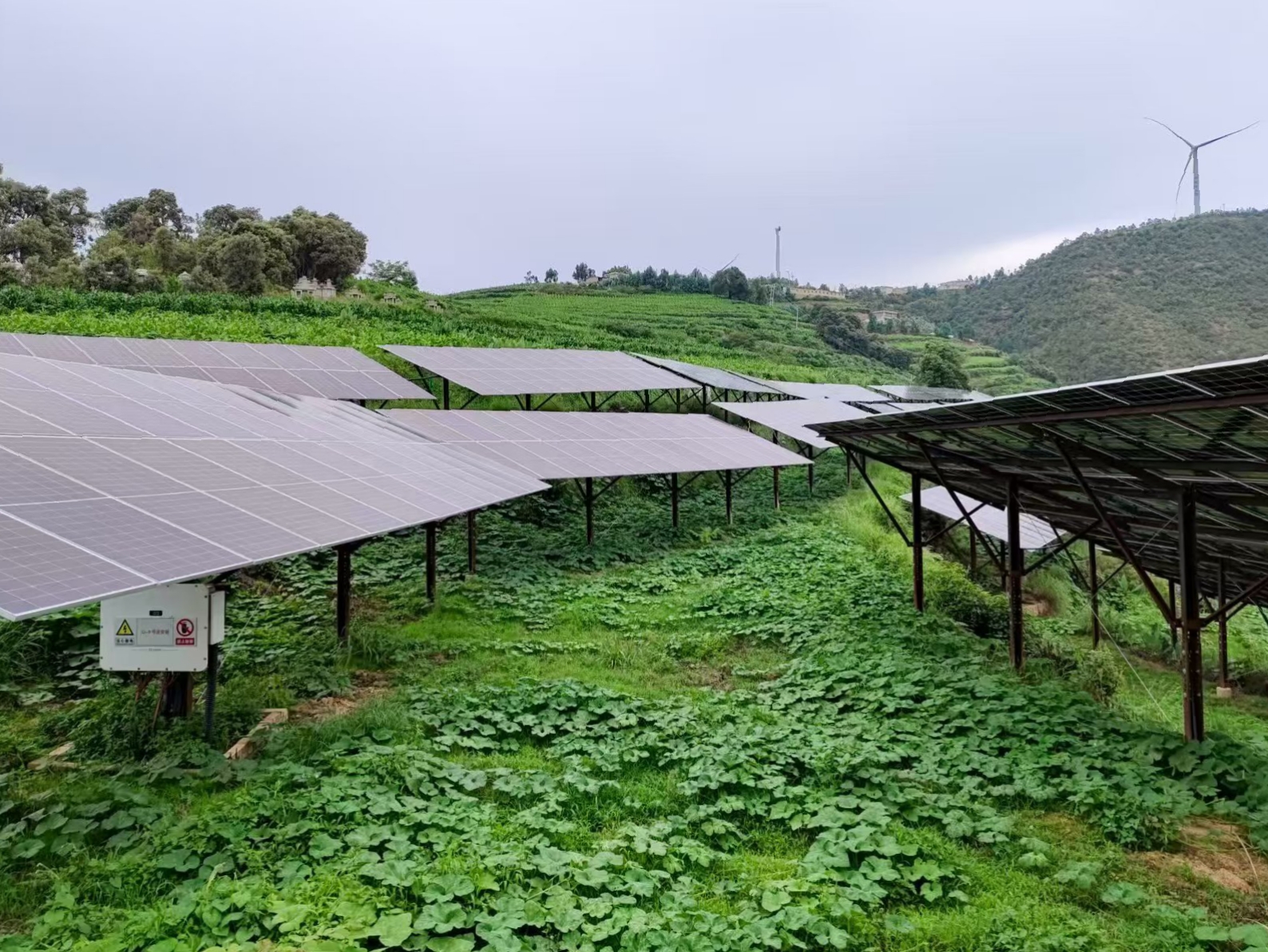 在南华县一街乡陆家垭口的光伏电站项目区,一幅“板上发电、板下种植”的和谐画卷正蓬勃展开:深蓝色的光伏矩阵在高原阳光下熠熠生辉,源源不断汲取清洁能量;而光伏板荫蔽之下,成行成垄的翠绿绞瓜舒展碧叶,迎风摇曳,生机盎然。