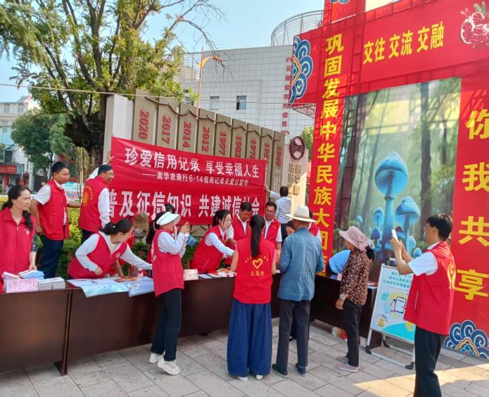 今年6月是第18个全国“6·14信用记录关爱日暨社会信用体系建设宣传月”,为提升社会公众的信用意识和维权能力,引导企业诚信经营,营造诚实守信的良好社会氛围,持续优化营商环境。南华县发展和改革局组织社会信用体系建设成员单位、金融机构在龙泉广场开展“守护信用共赢未来”主题活动。