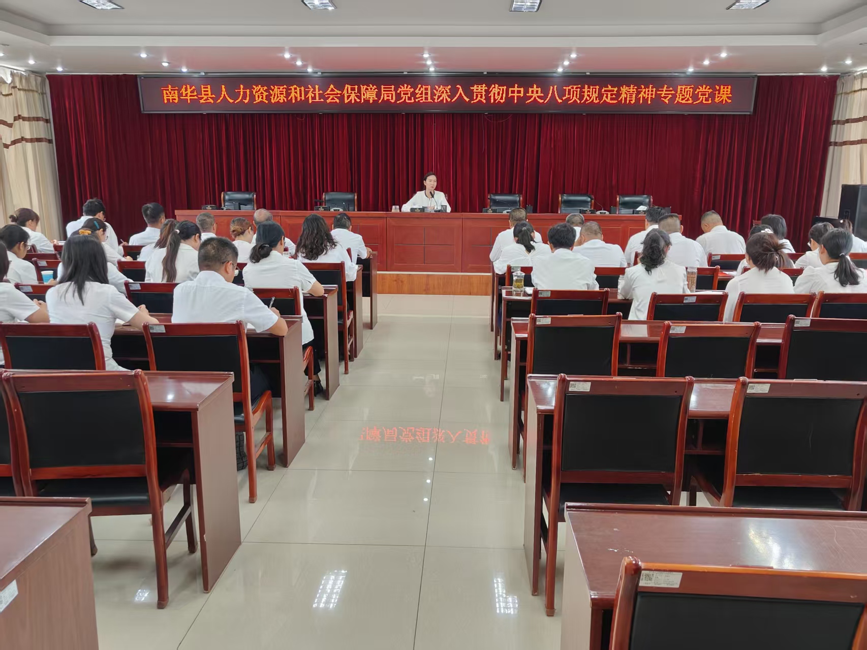 讲授专题党课,促进作风转变。结合深入贯彻中央八项规定精神学习教育,局党组书记以“坚守初心使命 锻造过硬作风 以中央八项规定精神引领人社事业高质量发展”为题讲授专题党课,带领全体党员温习中央八项规定精神,总结县人社局当前取得的成绩,深刻分析干部队伍中存在优势和劣势,提醒党员干部担当作为要做到“五个必须”,推动党员干部将学习教育成效体现在转变作风、为民服务、推动发展质效上。