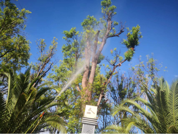四是加强病虫害防治工作。时下是病虫害的高发期,也是防治病虫害的关键时期,绿化养护工作人员坚持“预防为主,综合防治”原则,对绿化苗木进行用药防治,有效清除园林植物病虫卵,降低病虫害的发生率,保障绿化苗木正常生长。