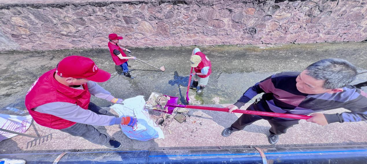本次主题党日活动以河湖保护治理为主要内容,由党员带头,广大干部职工积极参与,对幸福枫景A区入口处至镇南院子售楼部、县人民银行后至家豪小区入口、个私街(阳光小区)至土城村入口、土城村入口至龙川江入口四段河道进行全面清理,提升河湖综合整治,共建共享美丽家园。活动过程中,大家顶着炎炎烈日,以饱满的热情投入到河道清理中。大家手持铁铲、锄头等工具,你追我赶清除河道内的淤泥、垃圾、石块等杂物,疏通河道“梗阻”,河道环境得到了显著改善。