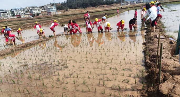 科技示范,实践见真知。农业农村局的4名科技人员亲自下田做示范指导,拉线、手把手教同学们栽插,如何分秧、怎么握苗、栽入深浅、株行距等进行耐心指导,讲给他们听、做给他们看,陪他们一起探索、求知。同学们兴致高、认真学、虚心问,虽然栽出的秧苗不那么笔直、漂亮,但脸上是满满的开心和成就感。田间实践、亲自动手,他们体会到了劳动的快乐与坚辛,懂得珍惜粮食,让农业科技的种子在他们心中萌发,培养爱劳动、学科学、爱科学的新时代好少年。
