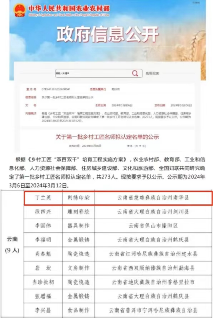 近日,农业农村部、教育部、工业和信息化部、人力资源和社会保障部、住房和城乡建设部、文化和旅游部、全国妇联发布通知,公布了第一批乡村工匠名师名单,共273人。云南省共9人,我县丁兰英上榜!