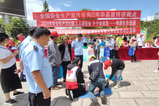 活动现场悬挂布标,设置咨询展台,各部门结合职能职责现场开展咨询服务,发放宣传资料,展示抢险设施设备,模拟事故现场心肺复苏、伤员救治,向群众广泛宣传道路交通、燃气安全、有限空间作业、消防、建筑施工、用电、防溺水、突发应急避险、防震减灾、食品药品等安全知识,耐心解答各类安全生产问题。同时,各乡镇加强联动,及时组织开展“安全生产月”系列宣传教育活动,普及安全知识,进一步推动“安全生产月”活动走深走实,有效提高公众安全意识和避险逃生能力,在全县大力营造安全人人有责、人人参与的良好氛围。