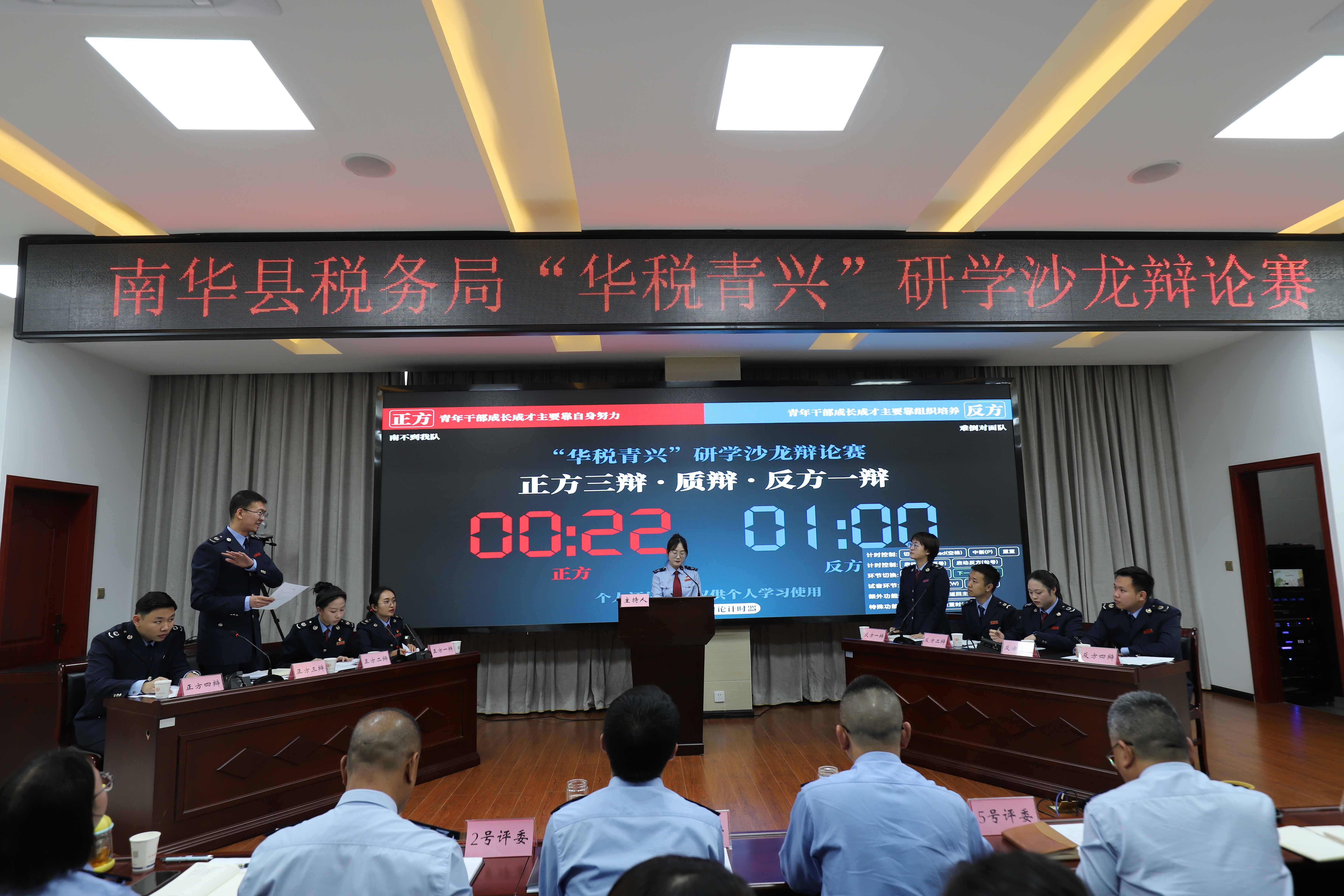 为深入学习宣传贯彻党的二十届三中全会精神,10月24日,南华县税务局举办“华税青兴”研学沙龙主题辩论赛。8位90后青年干部组成的2支辩论队,就“青年干部成长成才主要靠自身努力还是组织培养”辩题展开了激烈的“唇枪舌剑”辩论,赛会上双方辩手逻辑缜密,论证充分,你来我往,应对从容,充分展现了思考与辩论的魅力,赢得了现场观众的热烈掌声。