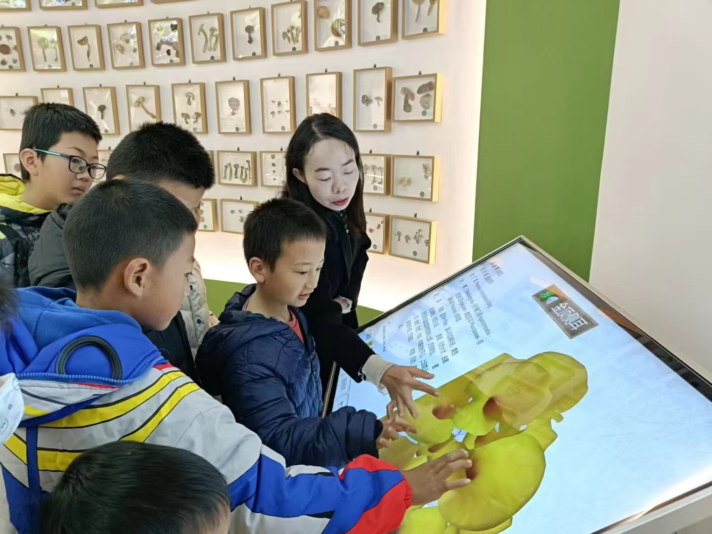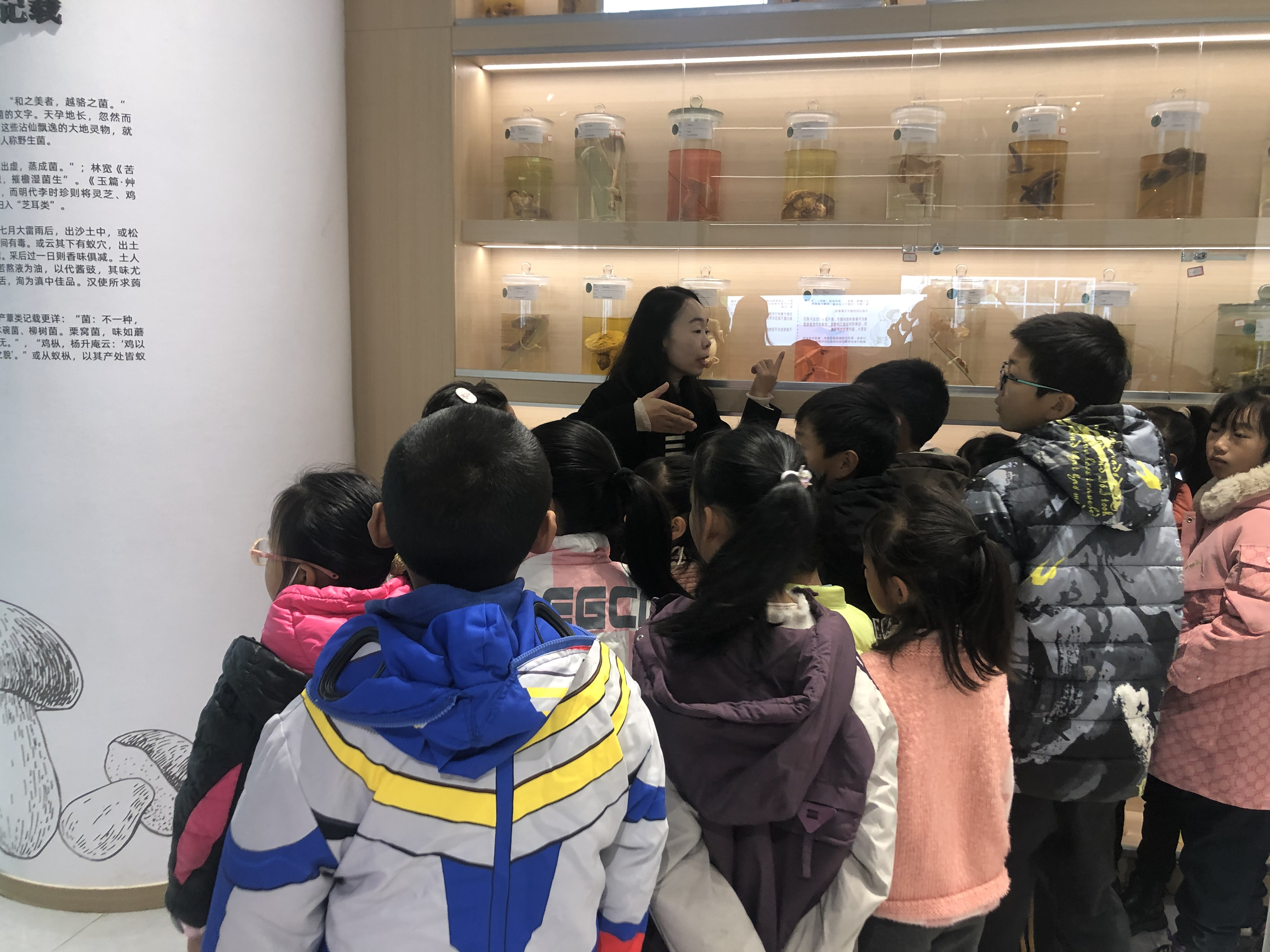 孩子们紧紧地围着讲解老师,认真地参观着参观野生菌标本。“看,这个是鸡枞菌,它就像一把小伞。”“这个红红的蘑菇是有毒的哦,在野外见到可不能随便采摘。”讲解老师耐心地为孩子们介绍着每一种野生菌的特点。孩子们一会儿看看这个标本,一会儿看看那个图片,小脑袋里充满了问号和惊叹号。