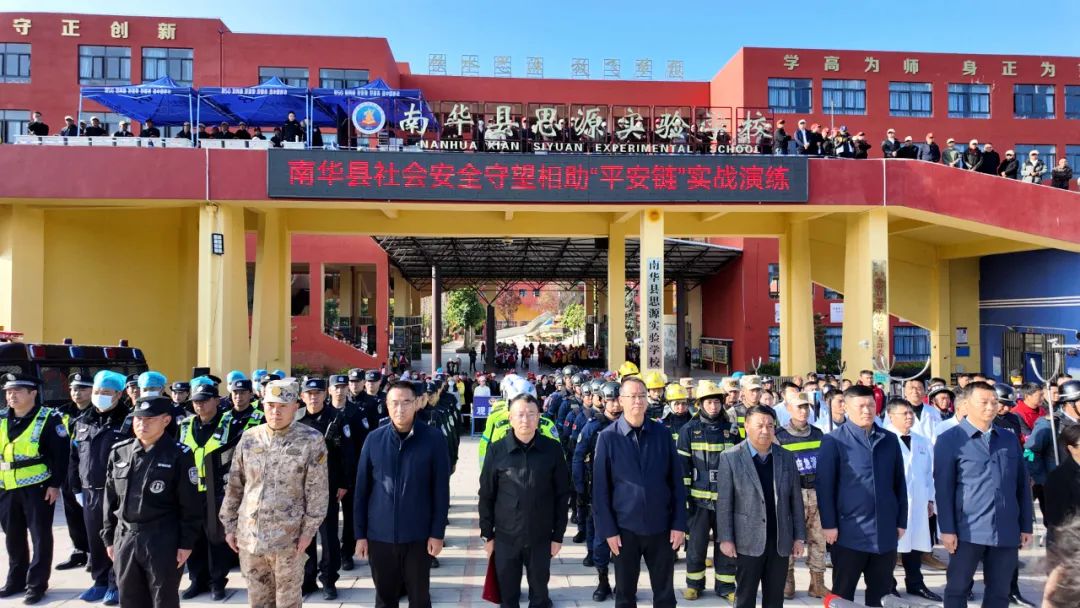 演练以南华县思源实验学校门口突发案件处置为模拟。警情发生后,南华县迅速启动社会安全守望相助“平安链”联保机制和极端案事件处置预案,学校迅速反应,拉响警铃、敲响铜锣、按下报警键,在第一时间向思源实验学校周边县人武部、县医院等单位发出求助信号,学校周边应急队伍和公安专业处突力量火速赶赴现场开展工作,突发警情得到快速有效处置。