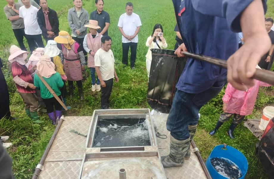 2025年我县向上争取资金30万元,在龙川、沙桥、雨露、罗武庄4个乡镇10个村委会推广稻渔综合种养600亩,每亩投放福瑞鲤鱼苗15-20kg,在龙川江流域实施160亩。培训会现场观摩并投放鱼苗900kg,对稻渔综合种养从田块选择,水源水质、排灌保水、田间工程、防逃逸、鱼苗投放技术要领(鱼苗消毒、水温控制等)、农药施用、日常管理要点、注意事项、稻花鱼米营销等进行了详细讲解。