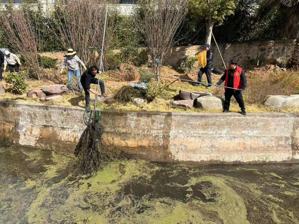 活动现场,党员干部们身着志愿服,迅速分成多个小组,手持铁钳、垃圾袋、扫帚、捞网等工具,分工协作、默契配合。活动不仅针对河道沿岸的塑料瓶、纸屑、枯枝败叶以及隐藏在草丛中的顽固垃圾进行细致清理,还重点开展了浮萍打捞工作。大家有的徒手捡拾岸边垃圾,有的用铁钳夹取河道浅水区杂物,有的则手持捞网俯身打捞水面漂浮的浮萍和水生杂物,再统一将收集的垃圾和浮萍分类打包并运送至指定垃圾收集点。尽管清理河道难度不小,但党员干部们热情高涨、干劲十足,以不怕脏、不怕累的精神全身心投入到劳动中,忙碌的身影构成了一道亮丽的风景线。