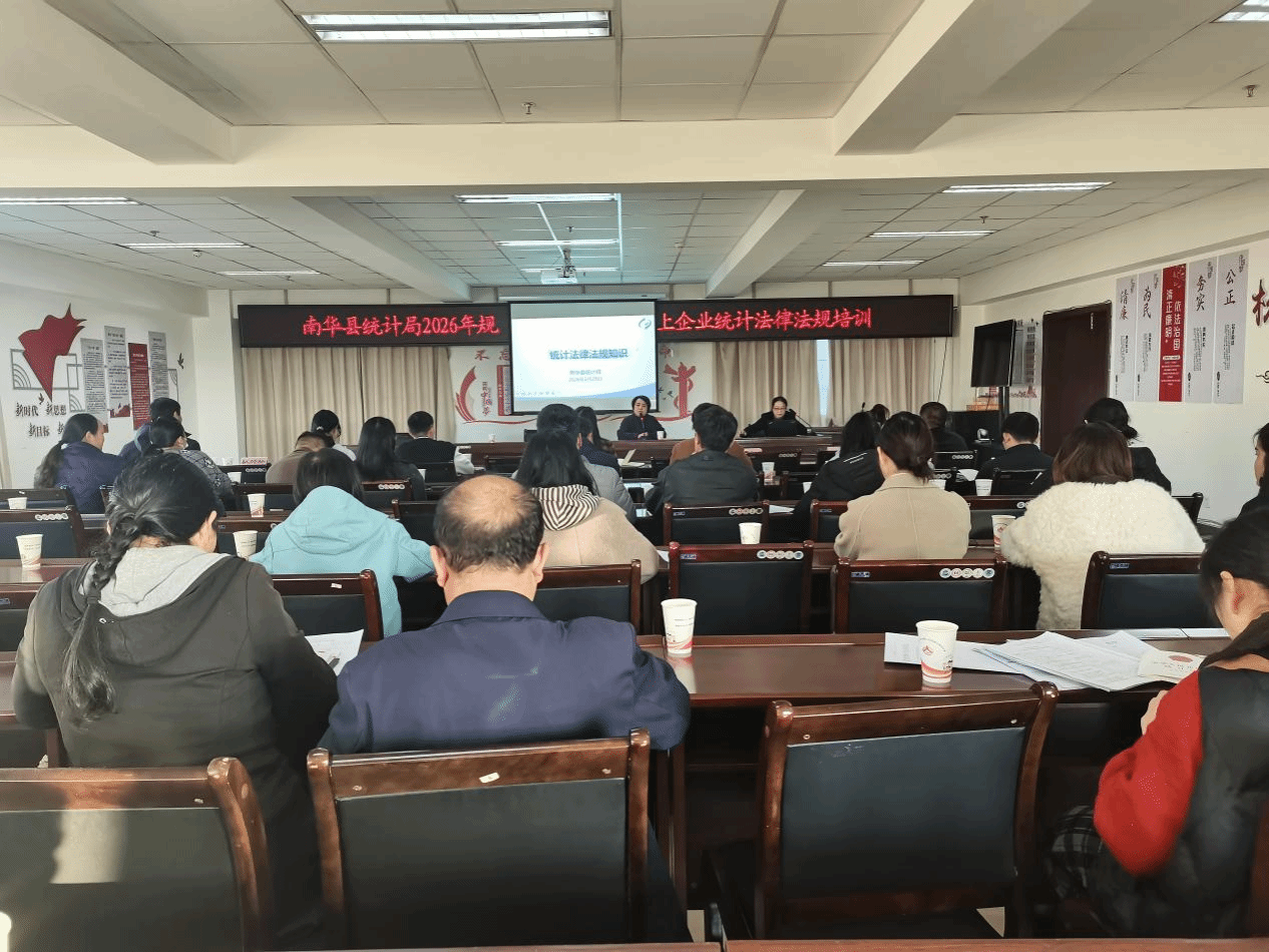 为进一步提升全县规模以上企业统计人员依法统计意识,夯实统计基层基础,1月29日,南华县统计局组织开展2026年规上企业法律法规培训会,8家行管部门分管领导及业务人员、规上工业、服务业企业统计人员共76人参加。