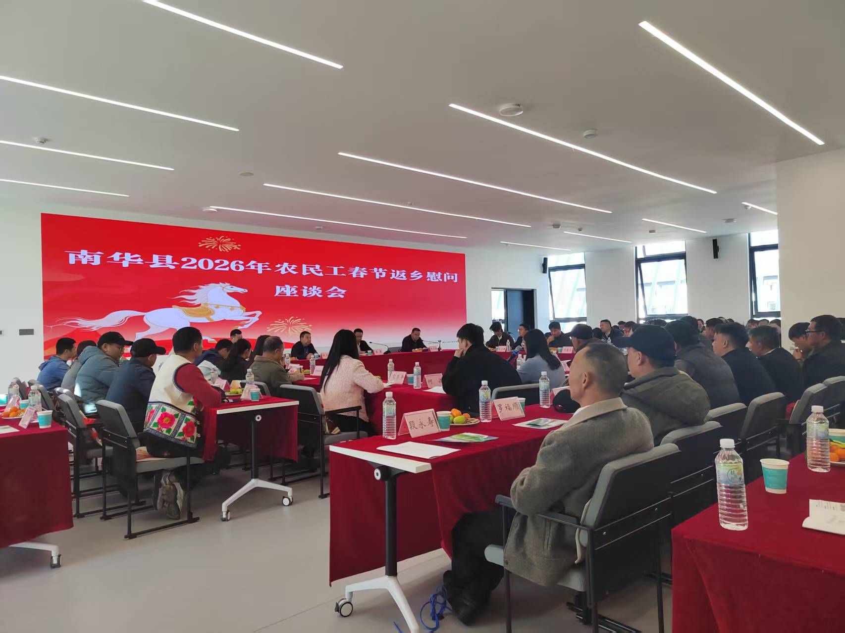 2026年2月12日下午,南华县野生菌交易中心至善非遗传习馆三楼会议室内暖意融融、乡情浓郁。2026年春节返乡人员慰问座谈会在此举行,外出务工代表、返乡创业先锋、致富带头人、劳务经纪人及企业负责人等80余人齐聚一堂,共叙乡情、共谋发展。这场别开生面的“新春第一会”,以实地观摩与深度对话相结合的形式,全景展现南华跨越发展的强劲脉动,诚邀在外游子归巢筑梦。