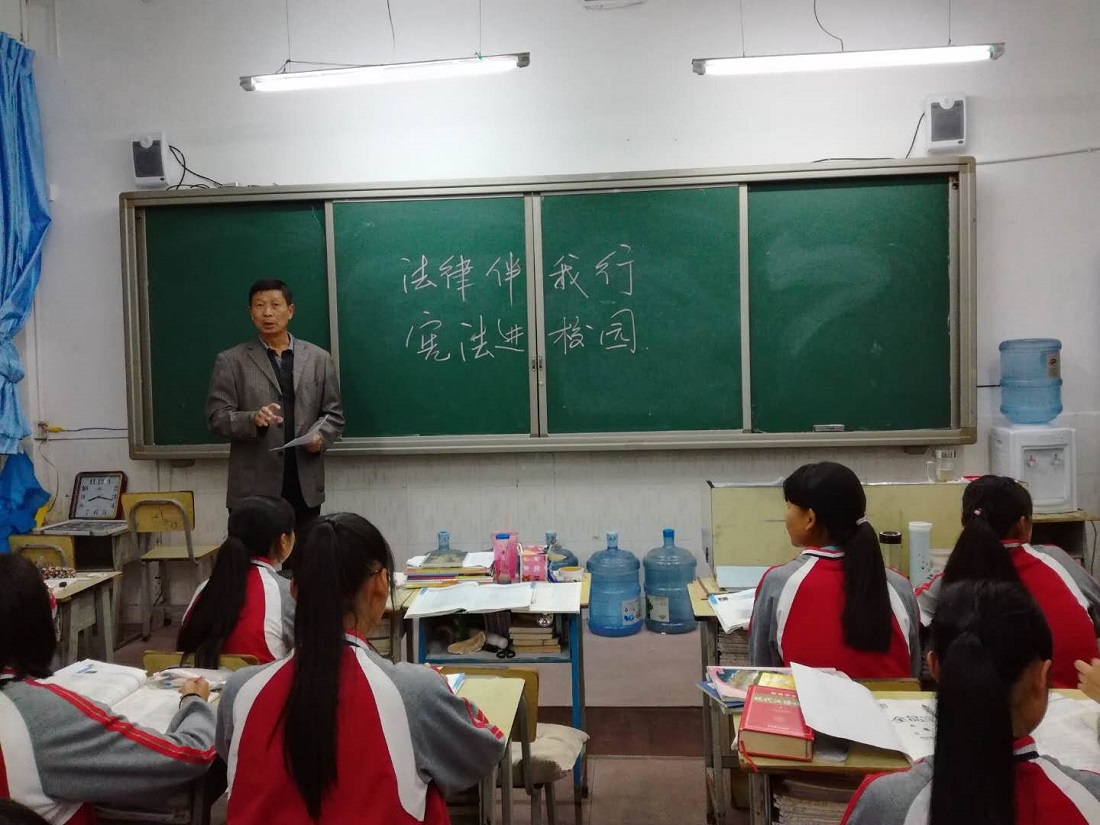 开展一次宪法(法治)宣讲活动。2018年10月12日下午3:00——6:00我校邀请南华县委党校讲师夏银香老师进行一节课的宪法宣讲;邀请南华县公安局禁毒大队李思明警官进行一节课的禁毒防艾知识讲座;邀请南华县交警大队李江教官进行一节课的交通法规知识讲座;邀请南华县公安局龙川派出所邱副所长进行一节治安方面的知识讲座;邀请南华消防大队的防火参谋进行一节课的防火知识讲座。