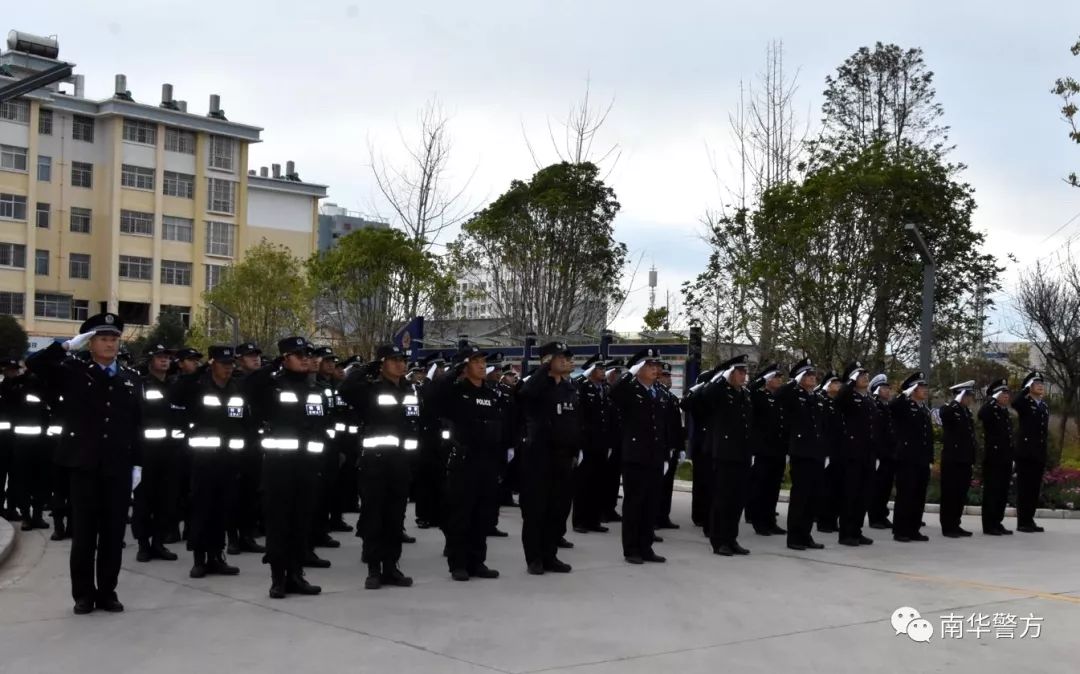 2019年1月1日上午9时,南华县公安局举行了庆元旦升国旗仪式,向伟大祖国祝福,表达忠诚爱国情怀。局党委班子成员,局机关、交警大队、特警大队、龙川派出所在家的全体民(辅)警100余人一同参加升旗仪式。