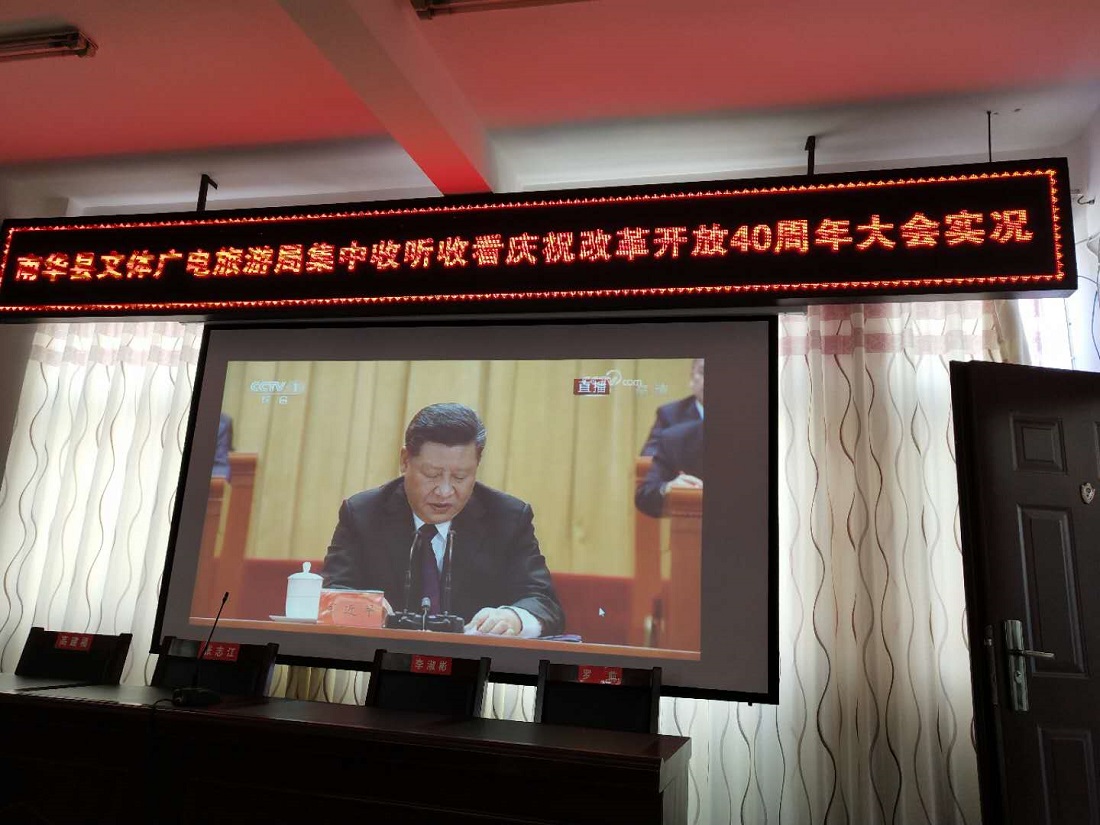 12月18日上午10时,庆祝中国改革开放40周年大会在人民大会堂隆重举行。南华县文体广电旅游局组织全体干部职工集中认真收听收看大会实况直播。