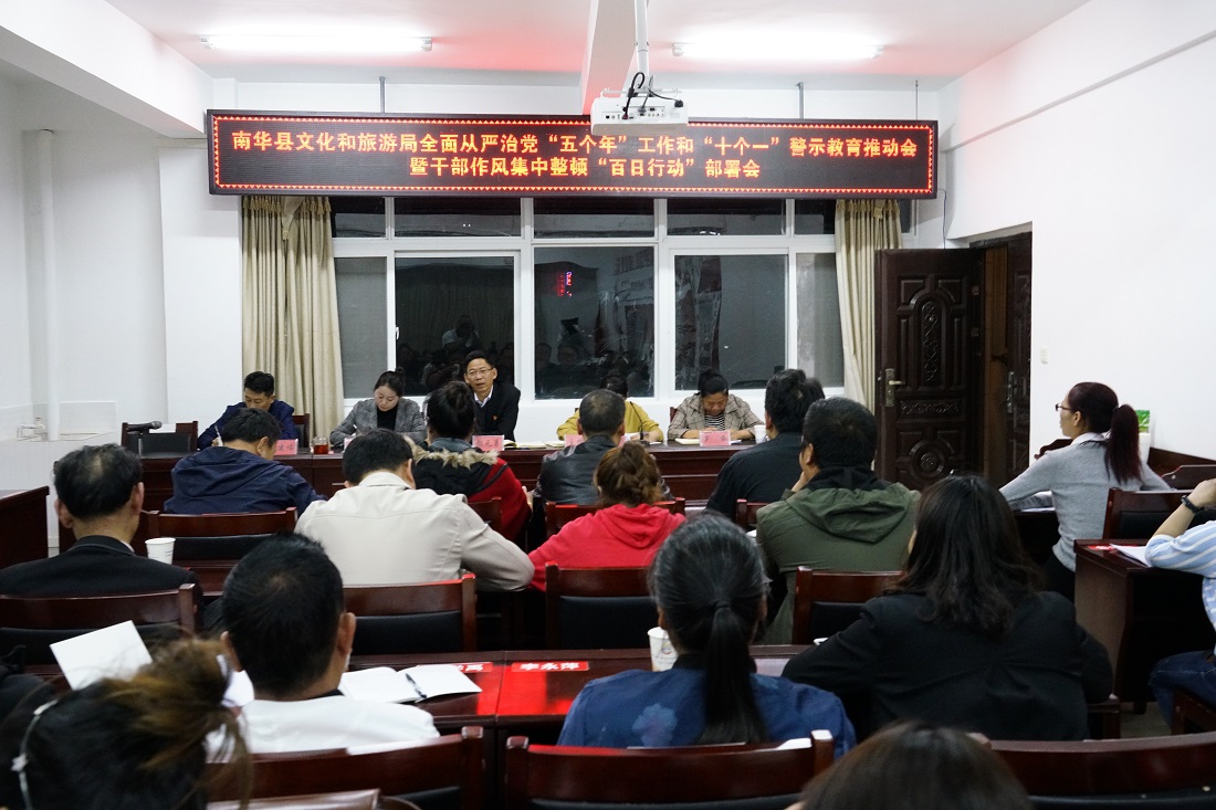 4月2日,南华县文化和旅游局党委召开全面从严治党“五个年”工作和“十个一”警示教育推动会暨干部作风集中整顿“百日行动”部署会,局属全体党员、全体干部职工参加会议。