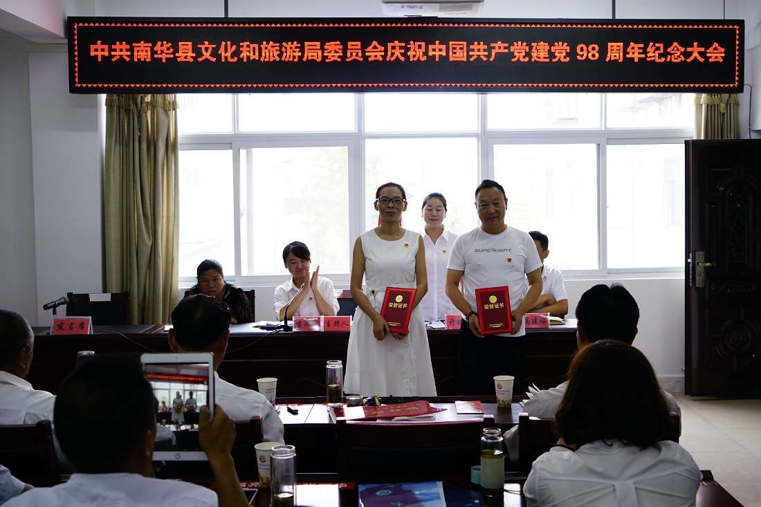 九十八载复兴路,沧桑巨变近百年。7月1日,南华县文化和旅游局庆祝中国共产党建党98周年庆祝大会在局机关二楼会议室举行,局党政领导班子成员及来自局属各条战线上的全体党员、全体干部职工参加了会议。