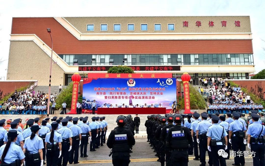 为认真学习贯彻习近平总书记在全国公安工作会议上的重要讲话精神,扎实推进扫黑除恶专项斗争和禁毒人民战争,向黑恶势力亮剑、向毒品犯罪宣战,向全社会表明州委、州人民政府、县委、县人民政府扫黑除恶、禁毒扫毒的坚定立场和决心。6月26日上午,楚雄州2019年“6.26”国际禁毒日宣传启动仪式和南华县“践行新使命、忠诚保大庆”誓师大会暨扫黑除恶专项斗争实战演练活动在南华举行。