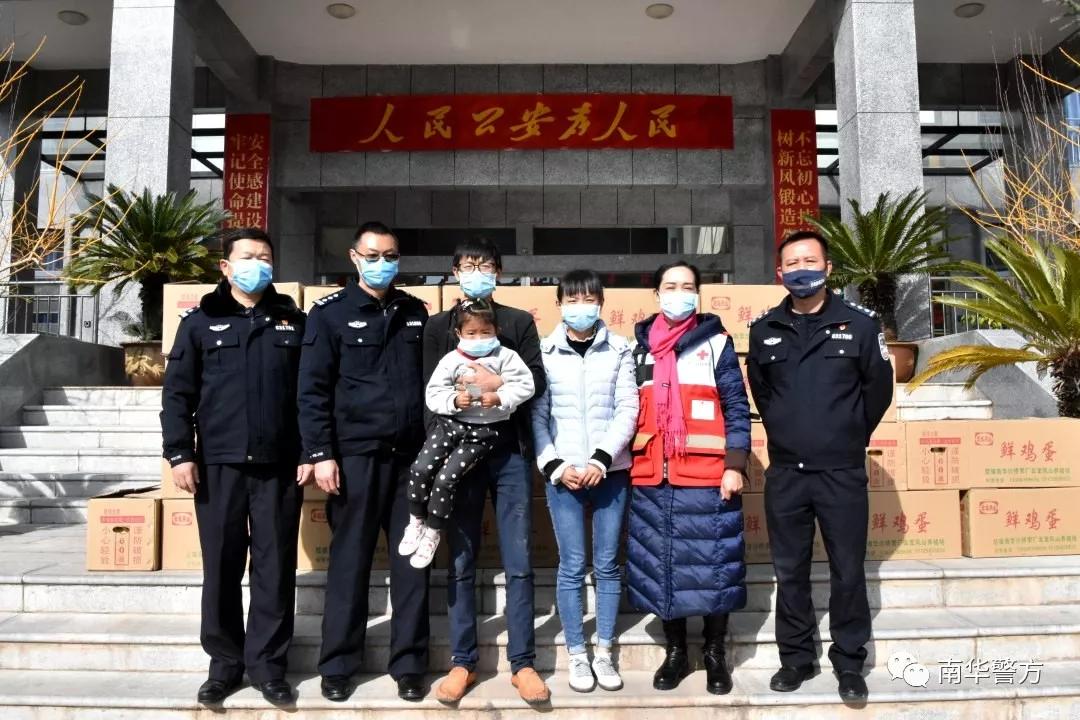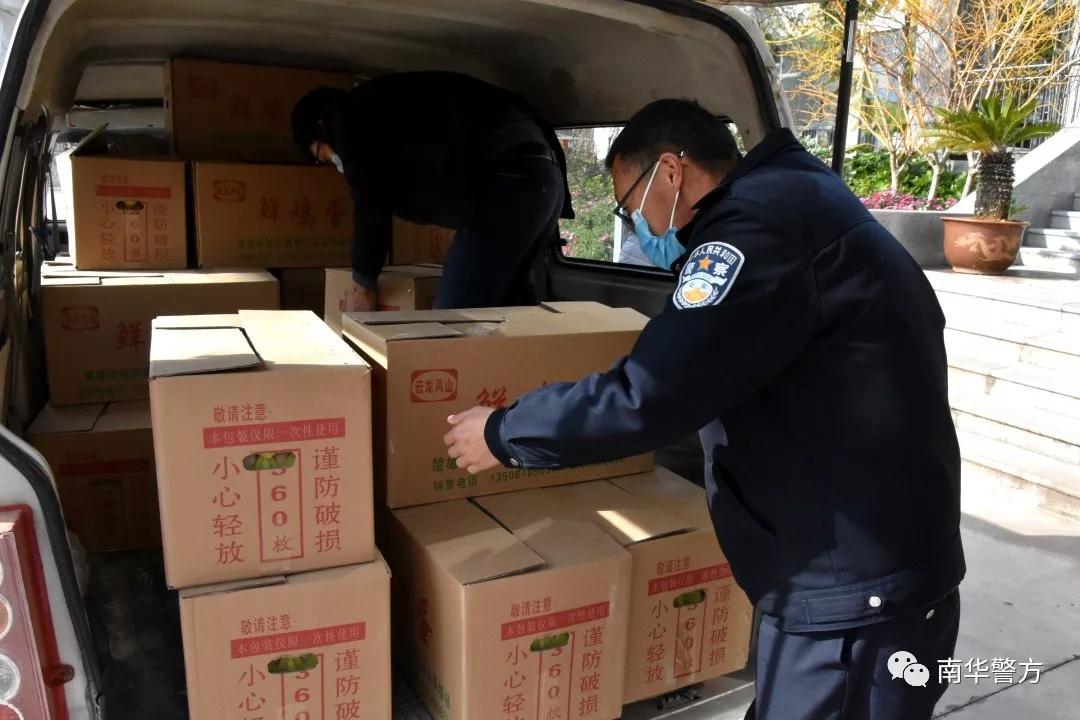 “警察同志,你们辛苦了,给你们带了一些鸡蛋来,感谢你们的辛勤付出,请一定要收下。”2月12日上午11时,在南华县红十字会的带领下,沙桥镇索厂蛋鸡养殖专业合作社的朱先生一家三口拉着48箱鲜鸡蛋来到南华县公安局,将17280枚鲜鸡蛋送到了民警的手中。