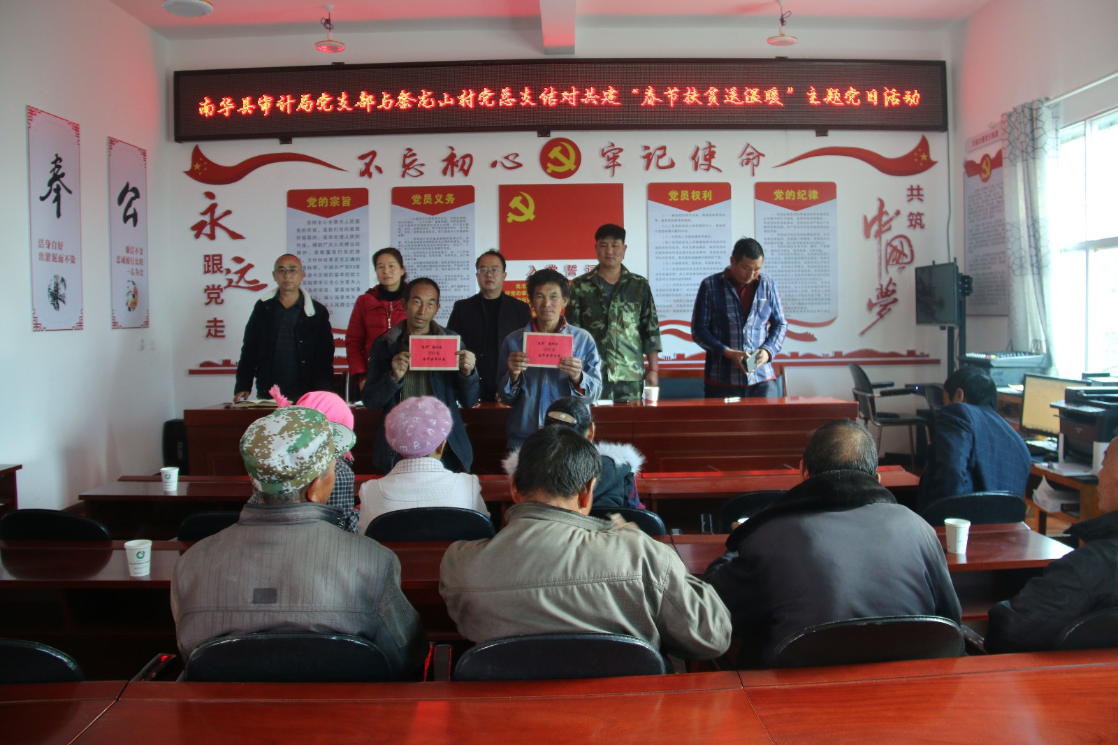 1月9日,南华县审计局党组书记、局长欧阳文经同志带领部分干部职工到扶贫联系点罗武庄乡祭龙山村委会,与联系村党总支结对共建开展“春节扶贫送温暖”慰问暨祭龙山村党员活动室和村史馆共建捐赠活动。