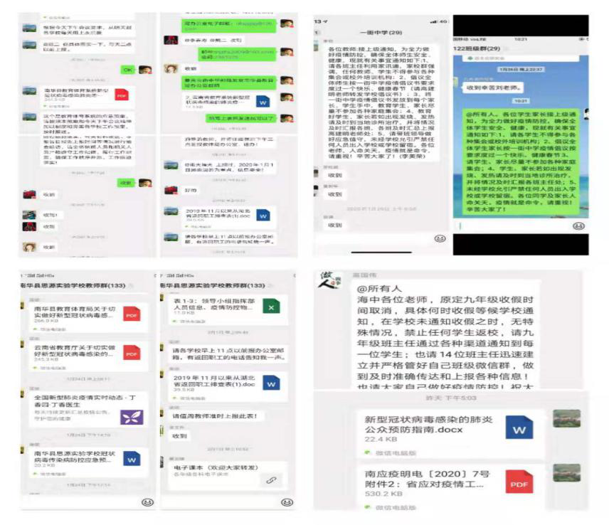 三是实行网格管理,做好日常防控。针对教育体育系统师生群体庞大、管控点多面广,疫情排查难度大等情况,南华县教育体育局创建了“应对疫情工作领导小组”微信工作群。通过微信群,把各级党委、政府的重大安排部署,和疫情资讯、防疫知识等内容适时推送给每位校(园)长和干部职工,校(园)长结合工作实际组织各自学校的班主任、教师利用家长群、校讯通等及时开展疫情防控知识宣传教育。同时,还依托微信工作群开展师生健康情况日统计、学生家庭从外省或途径外省返乡探亲人员情况统计和报送等工作。为做好疫情防控期间对学生学习生活的指导,组建了“微信课堂”课程教学团队,各科老师根据全县学生情况,筛选了部分授课课件(PPT)、参考资料和网络课程上传至微信工作群中,通过学习资料的层层传递,使疫情期间“停课不停教、停课不停学”的授课方式和学习方式更加丰富。