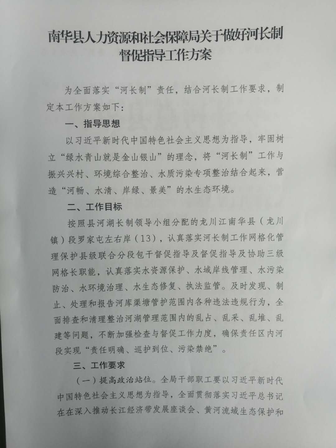 为全面深化落实河湖长制工作,认真履行河长工作职责,县人社局高度重视,积极行动,按照南华县人社局河湖长制工作方案,于近日组织相关人员及时对龙川江罗家屯社区河段左右岸共3.5公里责任区进行了现场巡河。