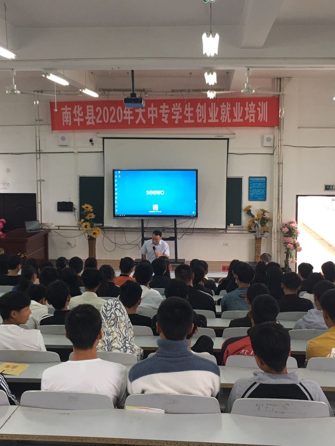 为做好我校学生创业就业服务工作,南华职中在团县委的大力支持下,于2020年9月23日上午组织高一高二学生开展“创业就业培训”,邀请南华天健农业公司总经理周自灵同志和南华蓝标电子商务公司总经理王朝选同志进行创业就业、电商创业和直播带货就业培训。