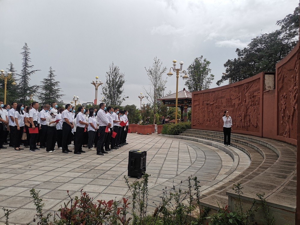 在革命老区浮雕纪念墙前,镇宣传委员为全体人员讲解了南华县的革命历史,带领大家走进红色的历史记忆,追忆老一辈革命家在南华这片热土上留下的红色故事,并在镇党委副书记的带领下,高唱《没有共产党就没有新中国》。