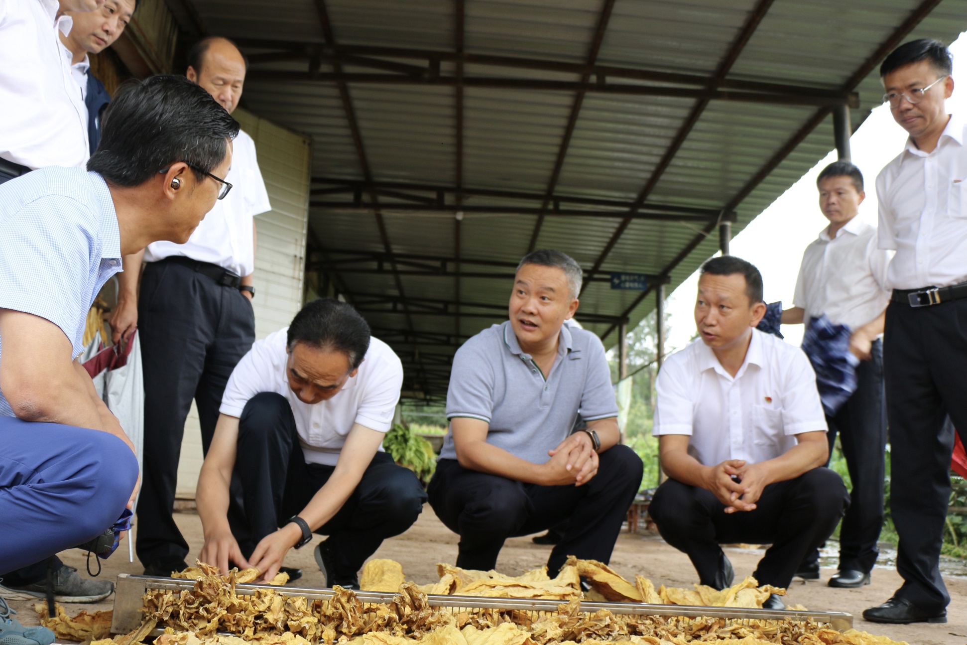 在沙桥镇田心村委会和爱村密集型烤房群查看初烤烟叶,详细了解分类采摘、分类编烟、分类装烟、商品化烘烤及烤后烟叶情况,并与烟农群众交谈。其间,听取了沙桥镇主要领导工作情况汇报。