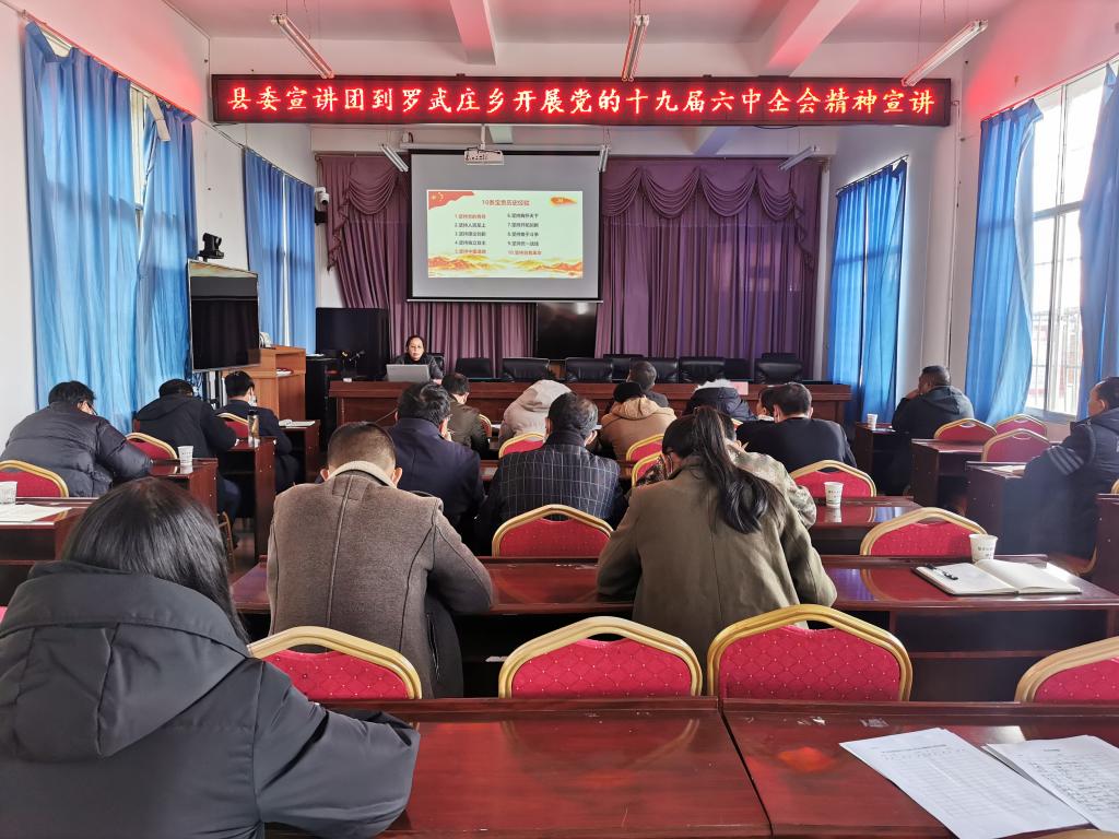 12月31日下午,县委宣讲团成员刘英到罗武庄乡开展党的十九届六中全会精神专题宣讲报告会,乡属全体干部职工参加会议。